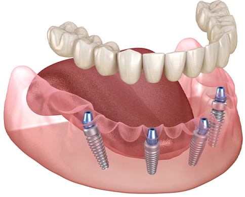 - All-on-four tekniği temelde daha az implant kullanımı yoluyla eksik diş tedavisi gerçekleştirmeyi içerir. Sabit bir köprü olarak kullanılan dişler implant ile tutturulurlar. Protez dişler gibi sürekli takıp çıkarmaya gerek kalmaz.